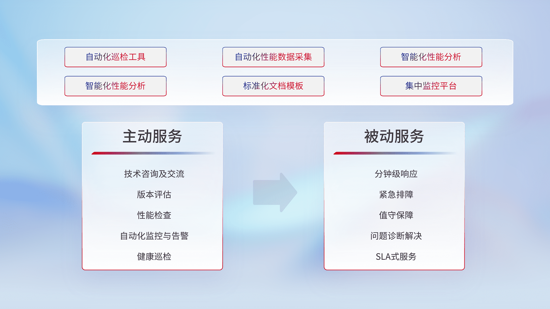 智能化工具和标准化文档,,,保障服务质量,,,提供主动服务(包含技术咨询、、、、版本评估、、性能检查、、、自动化监控与告警、、、健康巡检)和被动服务包含(分钟级响应、、紧急排障、、、、值守保障、、、、问题诊断解决、、、SLA服务)。。。